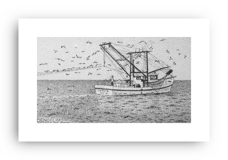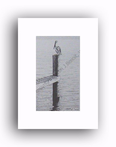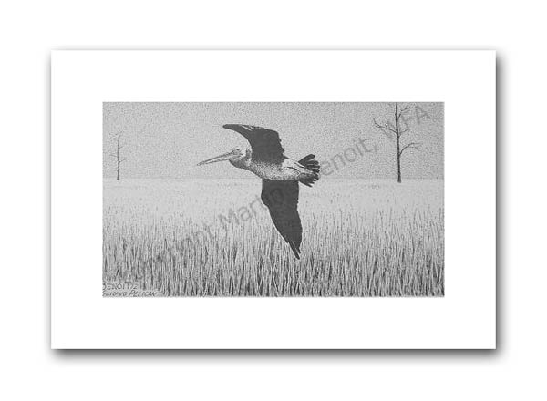 ![]() "Gliding Pelican" 2.5" x 4.5" image on 5" x 7" paper / 1000 Signed and Numbered prints / 8" x 10" double-matted size $10(ink print) / $20(handcolored print) $15(ink print with matting) / $25 (handcolored print with matting) |