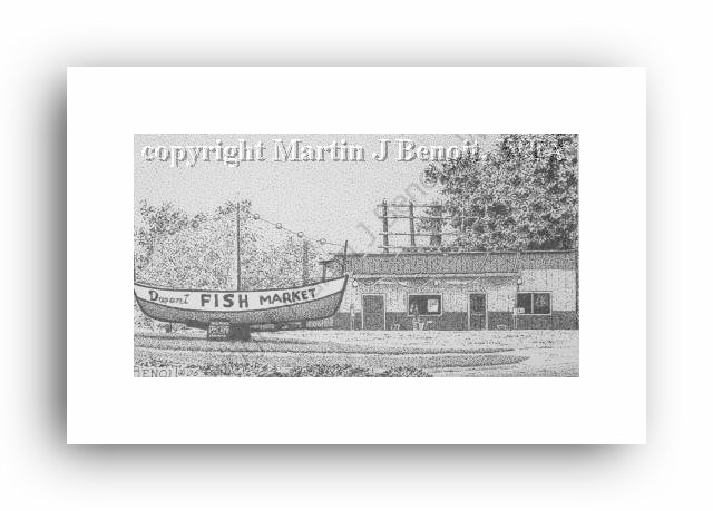 ![]() "Dupont Fish Market" 2.5" x 4.5" image on 5" x 7" paper / 1000 Signed and Numbered prints / 8" x 10" double-matted size $10(ink print) / $20(handcolored print) $15(ink print with matting) / $25 (handcolored print with matting) |