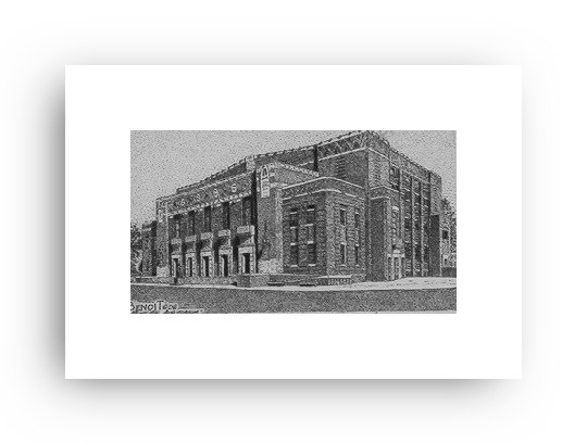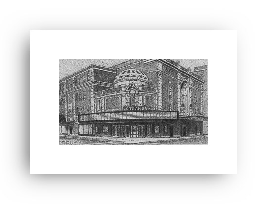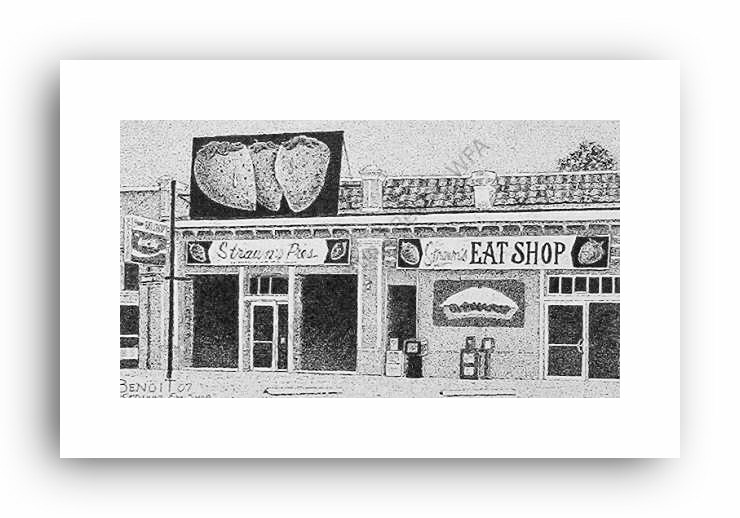 ![]() "Strawn's Eat Shop" 2.5" x 4.5" image on 5" x 7" paper / 1000 Signed and Numbered prints / 8" x 10" double-matted size $10(ink print) / $20(handcolored print) $15(ink print with matting) / $25 (handcolored print with matting) |