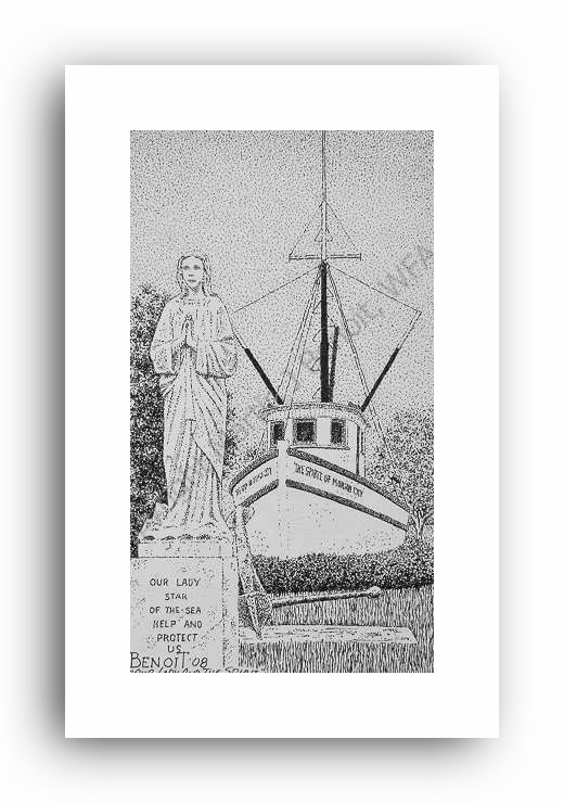 ![]() "Sabine Pass Lighthouse" 2.5" x 4.5" image on 5" x 7" paper / 1000 Signed and Numbered prints / 8" x 10" double-matted size $10(ink print) / $20(handcolored print) $15(ink print with matting) / $25 (handcolored print with matting) |