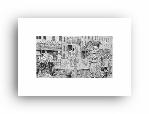 ![]() "Feeding The Masses" 2.5" x 4.5" image on 5" x 7" paper / 1000 Signed and Numbered prints / 8" x 10" double-matted size $10(ink print) / $20(handcolored print) $15(ink print with matting) / $25 (handcolored print with matting) |