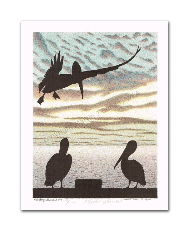 ![]() "Coming Home To Roost" 8"x 6" image on 10"x 8" paper / 300 Signed and Numbered prints / 11"x 14" double-matted size $25(ink print) / $50(handcolored print) $40(ink print with matting) / $65 (handcolored print with matting) |