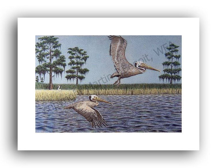 ![]() "Swamp Flight" 8"x 12" image on 10"x 14" paper / 520 Signed and Numbered prints / 14"x 18" matted size Unsigned Ink Open Edition 5x7 Print in 8"x10" matting available - $ 10.00 $50(ink print) / $100(handcolored print) $70(ink print with matting) / $120 (handcolored print with matting) (original available - email for price) |
