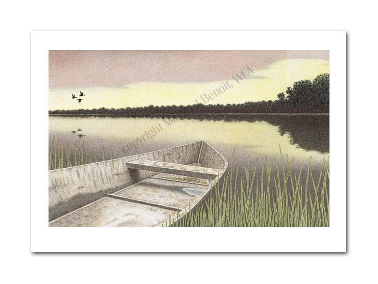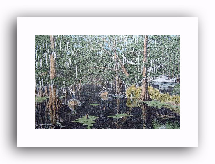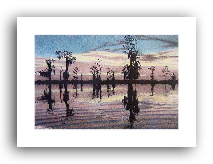 ![]() "Morning Over Manchac" 8"x 12" image on 10"x 14" paper / 460 Signed and Numbered prints / 14"x 18" matted size Unsigned Ink Open Edition 5x7 Print in 8"x10" matting available - $ 10.00 $50(ink print) / $100(handcolored print) $70(ink print with matting) / $120 (handcolored print with matting) |