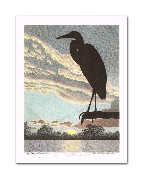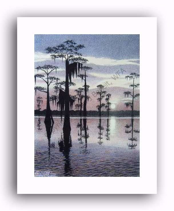 ![]() "Sunrise In The Swamp" 8"x 6" image on 10"x 8" paper / 470 Signed and Numbered prints / 11"x 14" matted size $25(ink print) / $50(handcolored print) $40(ink print with matting) / $65 (handcolored print with matting) |